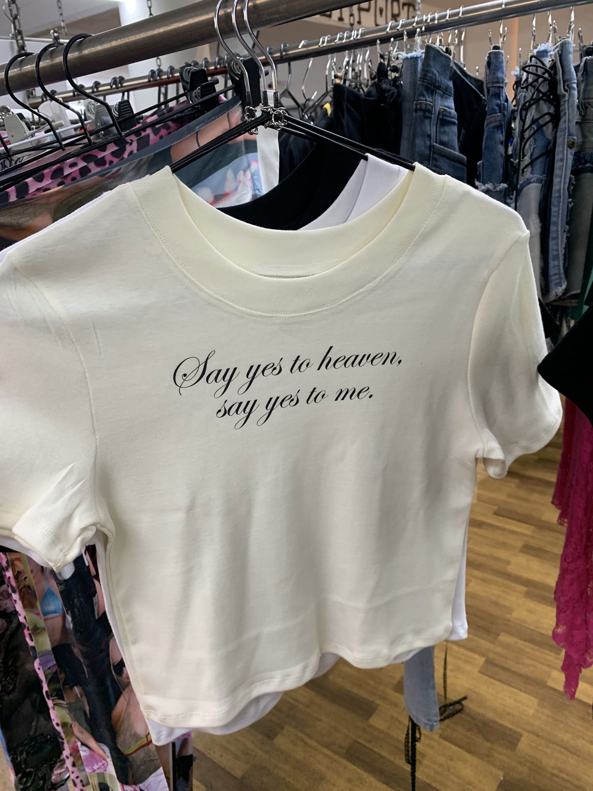 Baby tee de ribb de algodón peinado con estampa en en DTF de la canción Say yes to heaven de Lana del Rey